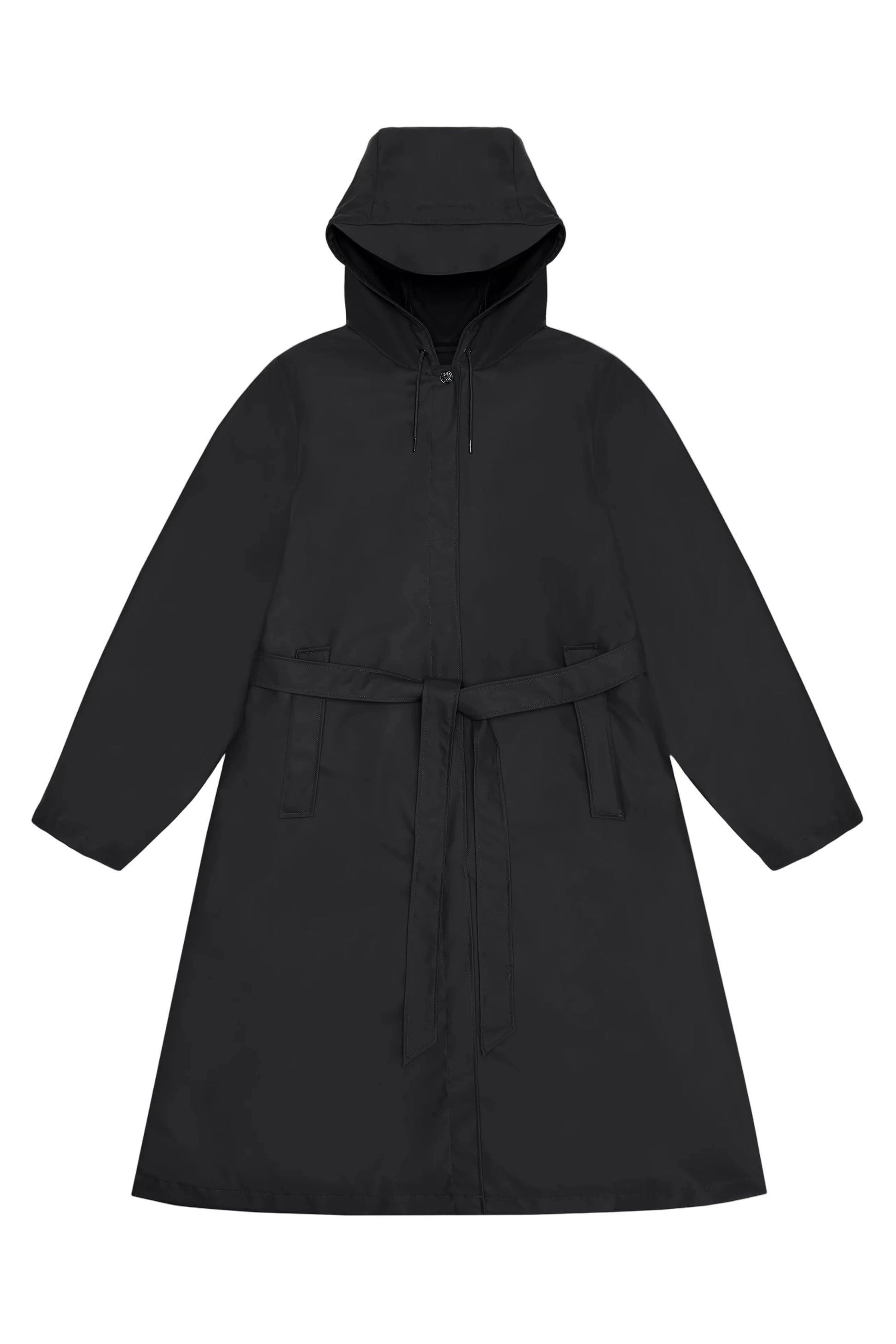 Deze langere varianr van de klassieke A-line jacket biedt extra bedekking en comfort tijdens regenachtige dagen. De jas heeft capuchon met trekkoord en ingebouwde klep, steekkzakken, verborgen drukknopen voor een strakke sluiting en verstelbare manchetten met drukknoop.