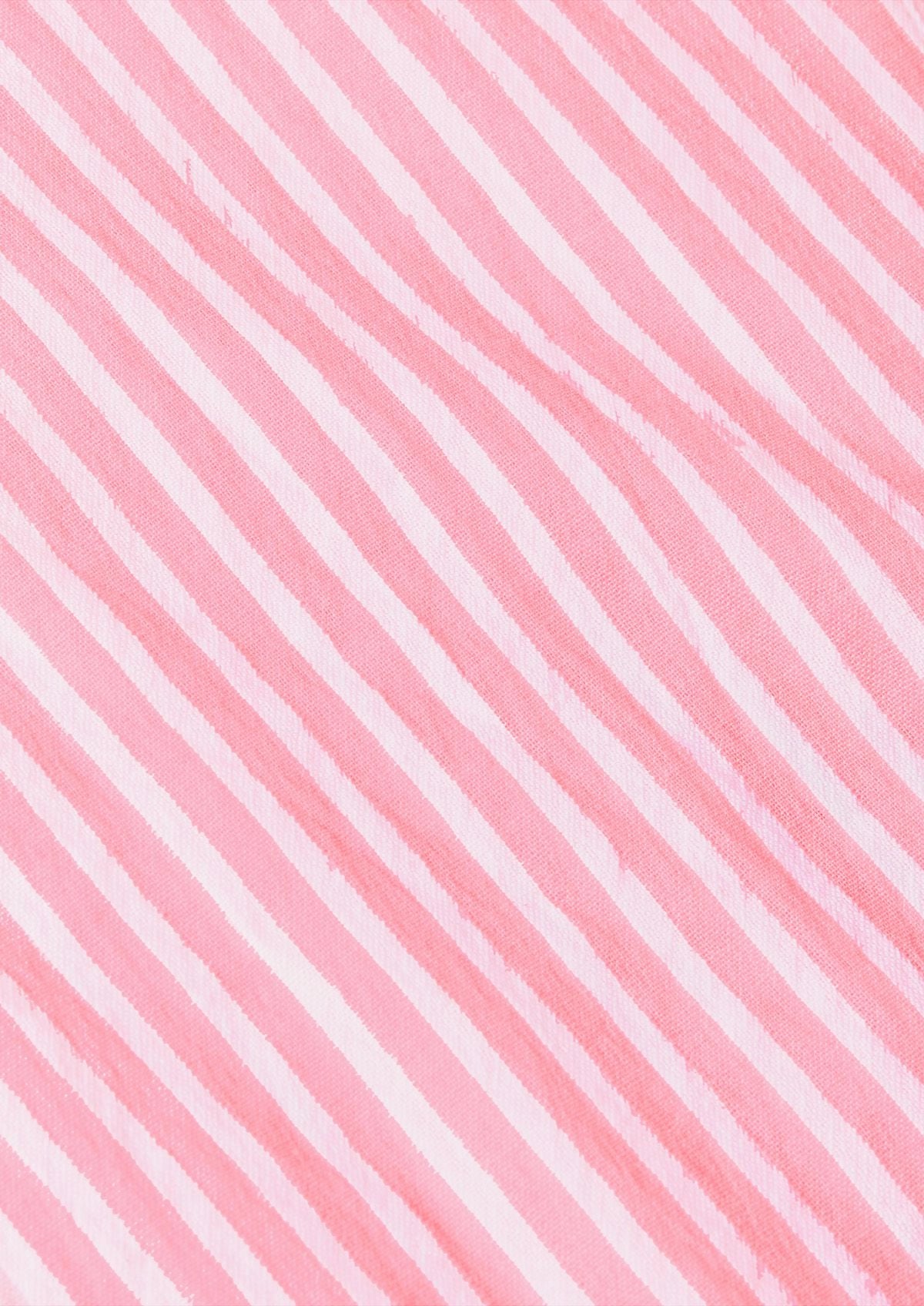 Oversized dames blouse met drop shoulders en een langere achterkant. De Elena blouse heeft een verticaal wit-roze streeppatroon en een knoopsluiting.
