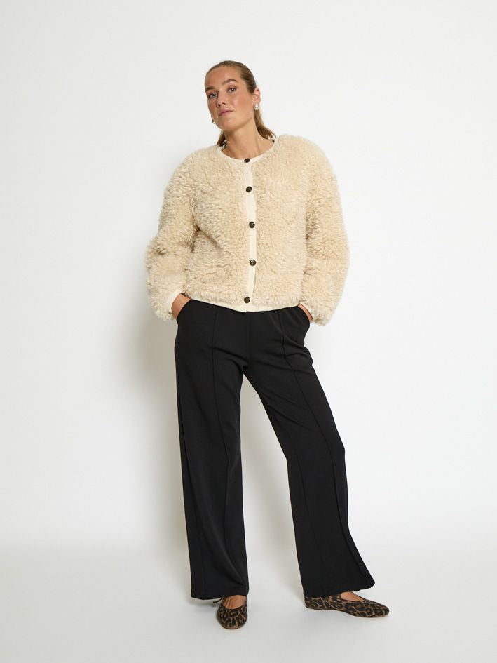 Deze korte Julia faux wollige jas van Peppercorn straalt moeiteloze elegantie uit. Het ronde halsontwerp, de volledige knoopsluiting en de ribgebreide boorden zorgen voor een verfijnde afwerking De zachte, gekrulde structuur geeft extra volume en warmte, waardoor dit item perfect is om in laagjes te dragen op koelere dagen - stijlvol en praktisch, zowel binnen als buiten.
